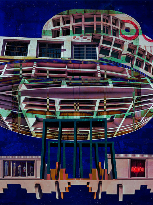 The Architecture Inspired Collection is a photographic deconstruction of the built world; seeing structures, buildings, and public spaces not merely as objects, but as silent, monumental characters, witnesses to the unwritten history of urban life. This series continues Lev's complex, signature process of layering countless photographs, allowing multiple moments in time and memory to coexist and reimagining familiar sites like the fictional roadside stop, Service Area #1, or the nostalgic, solitary view, I Met Edward Hopper Parallel Parking, into highly charged, new realities.