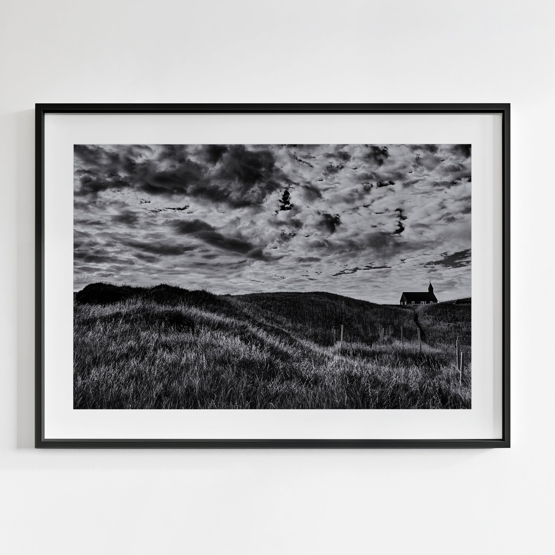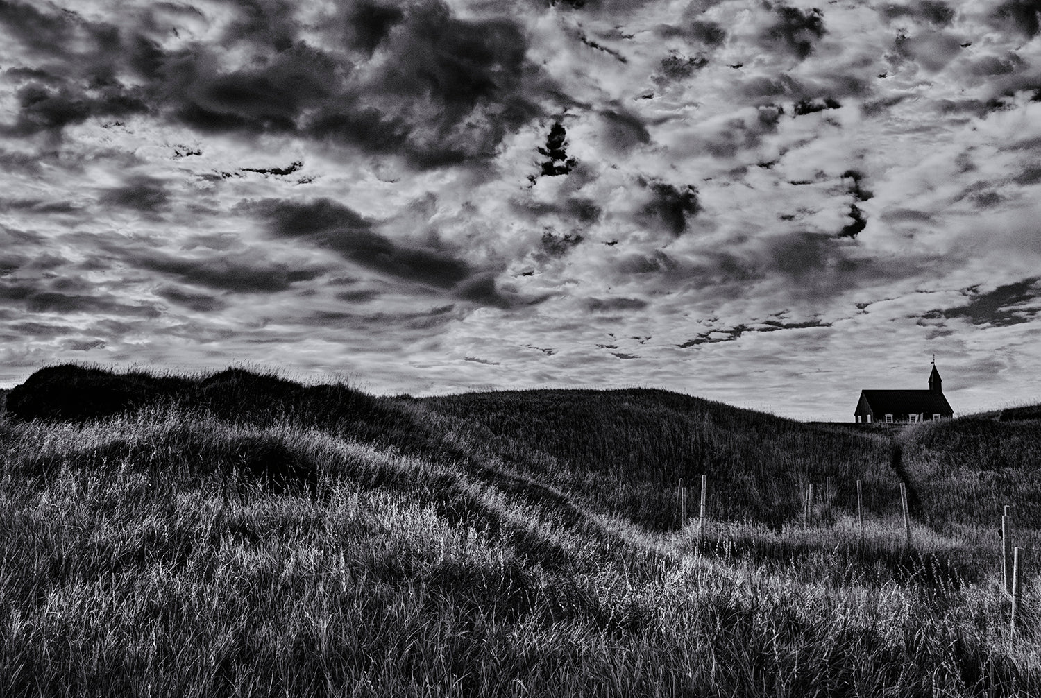 The 200-year-old Black Church, known as Búðakirkja, is located in Iceland in the Snæfellsnes Peninsula. This formidable silhouette is rendered in absolute black against a dramatically darkened sky, a contrast achieved by using a red filter which intensifies the atmosphere and amplifies the white clouds. The result is a profound visual statement on uncompromising belief and resilience, a single point of human creation whose severe, unwavering geometry stands firm against the vast consuming elements of time and nature.