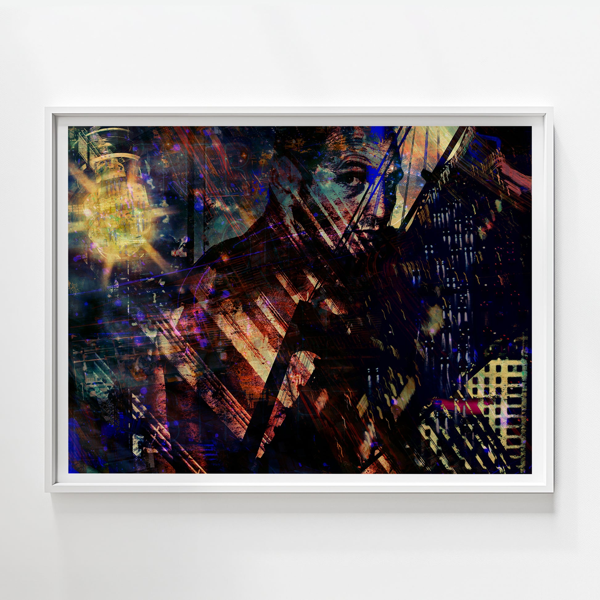 This series is an unedited, adrenaline-fueled conversation with chaos; a direct commentary on how completely we are immersed in pop culture. The pieces race a thousand miles a minute from the subconscious and explode into our conscious. Lev layers hundreds of carefully selected photographs to create vibrant cross-sections of the modern psyche, a dense architectural mapping of thought and digital noise.