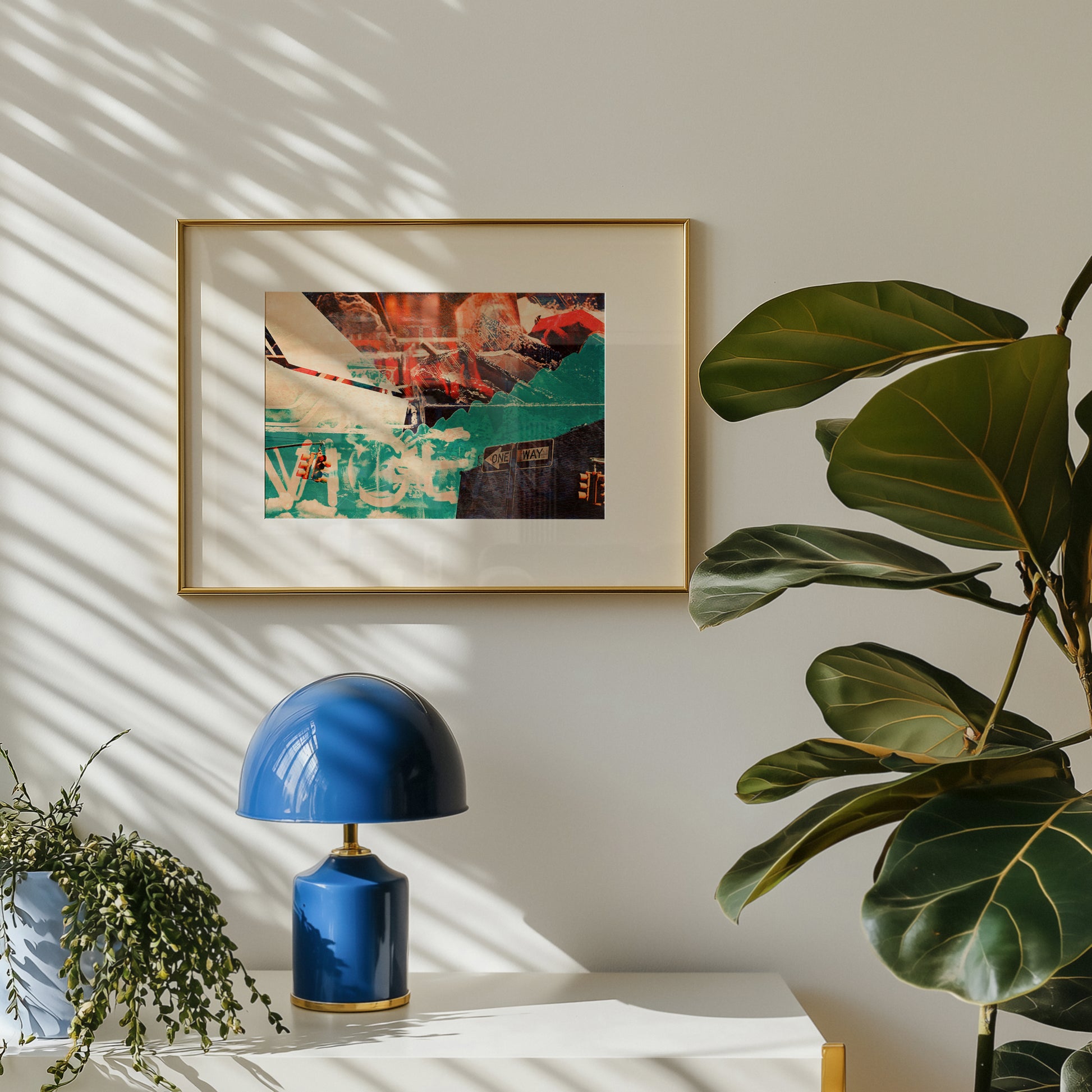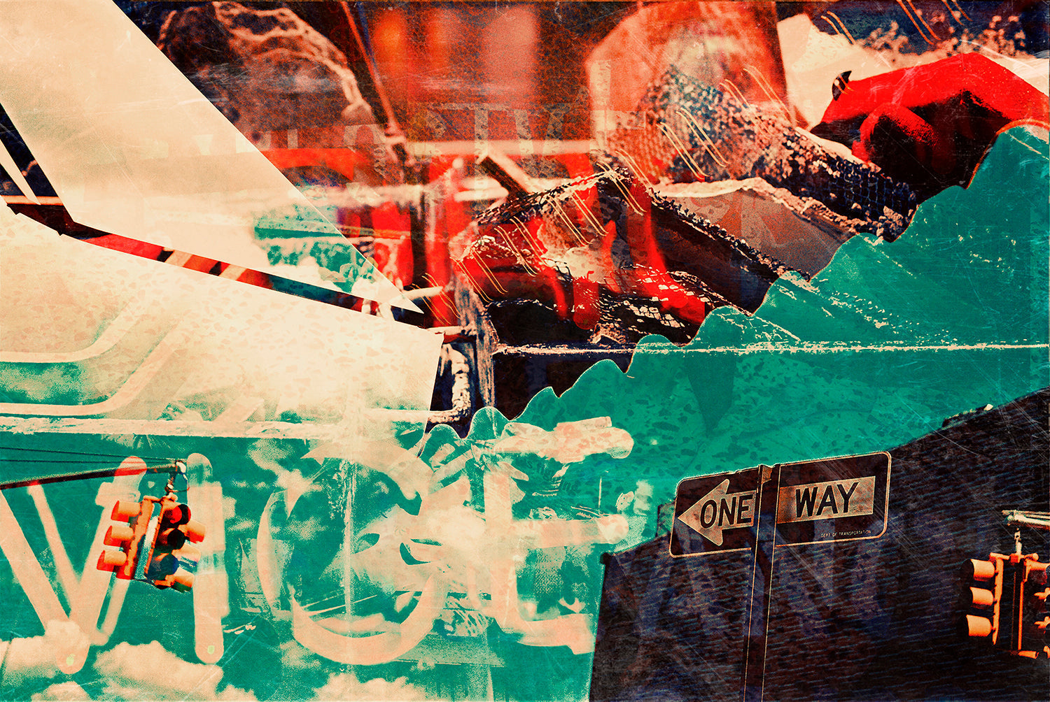 This series is an unedited, adrenaline-fueled conversation with chaos; a direct commentary on how completely we are immersed in pop culture. The pieces race a thousand miles a minute from the subconscious and explode into our conscious. Lev layers hundreds of carefully selected photographs to create vibrant cross-sections of the modern psyche, a dense architectural mapping of thought and digital noise.