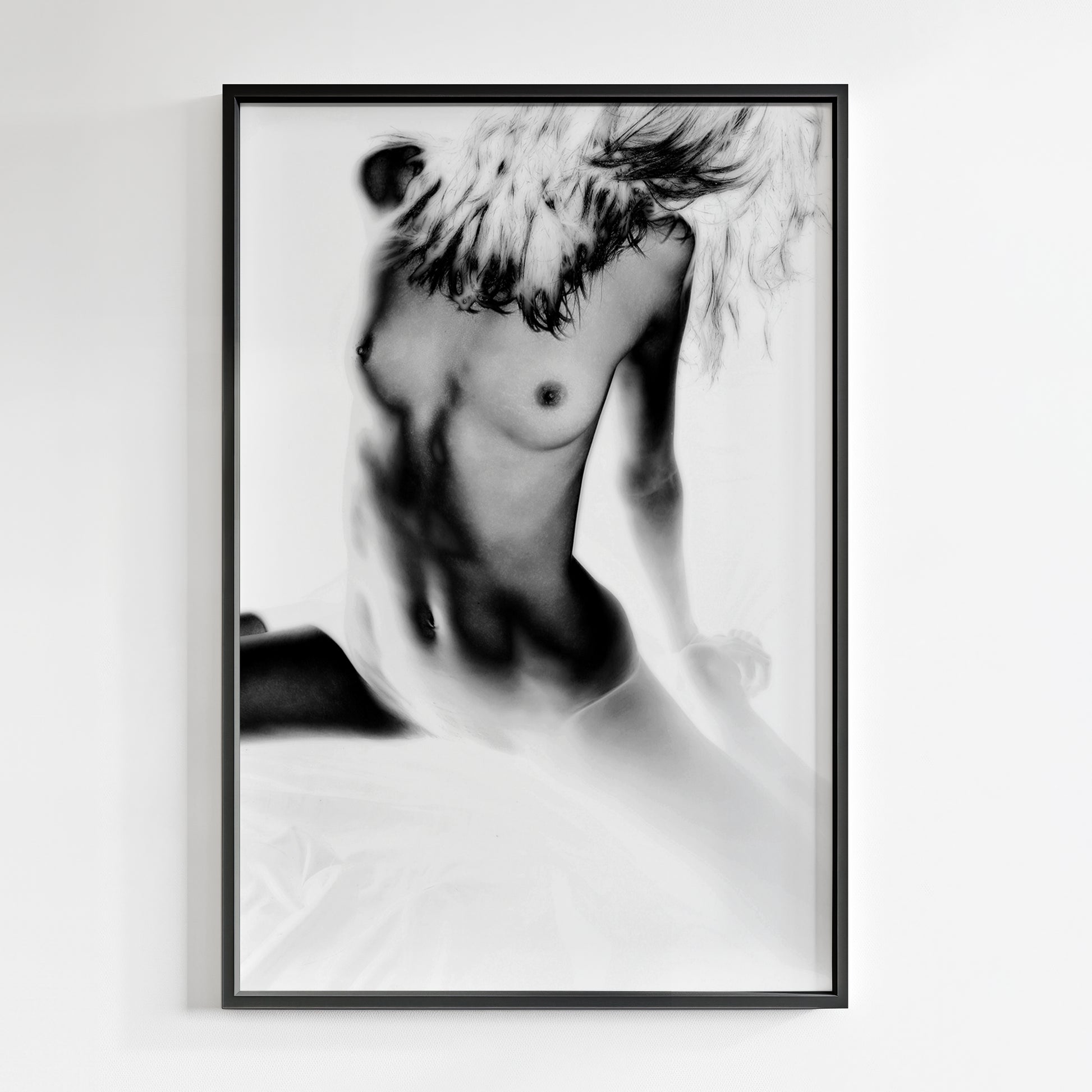 "Dancing In The White" is a deliberate, erotic celebration of the naked female body, an uncompromising act of exposure and aesthetic provocation. This series employs a modern, audacious interpretation of Man Ray's photographic solarization technique, where the reversal of tones does more than just abstract the image, it radicalizes it.