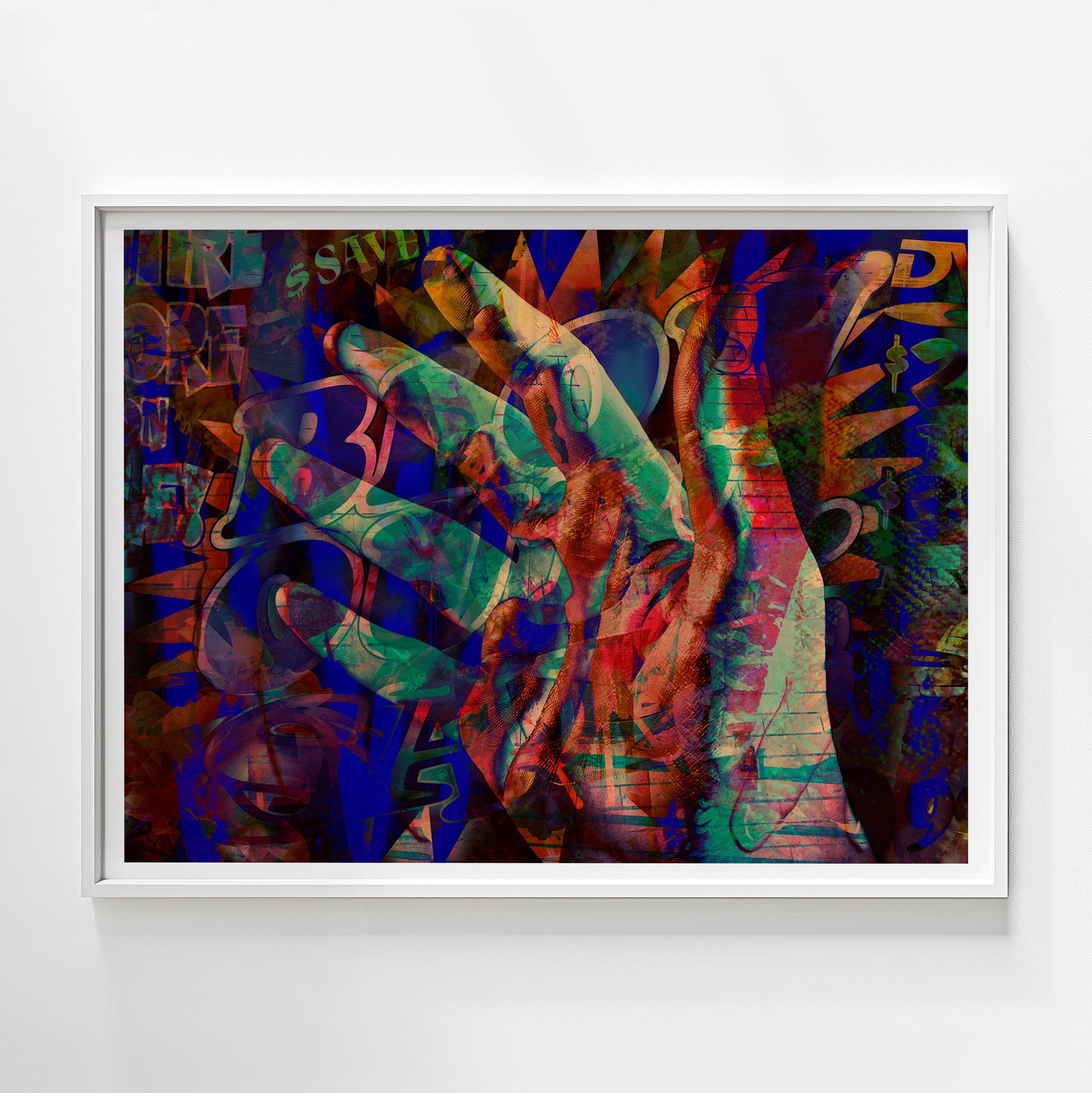 "Il Mano Del Dio Uno" is a maximalist meditation on creation, identity, and divine power. The visible hand belongs to the artist, Lev Gorn, while the title, "Hand of God," alludes to an inexplicable, non-human force. This double entendre asserts that the artist in the actor creation becomes God, and the artist's hand that creates the art is simultaneously created by God. This complex relationship between human control and ultimate, mysterious power, turns the artwork into a statement on the source of creativity itself.