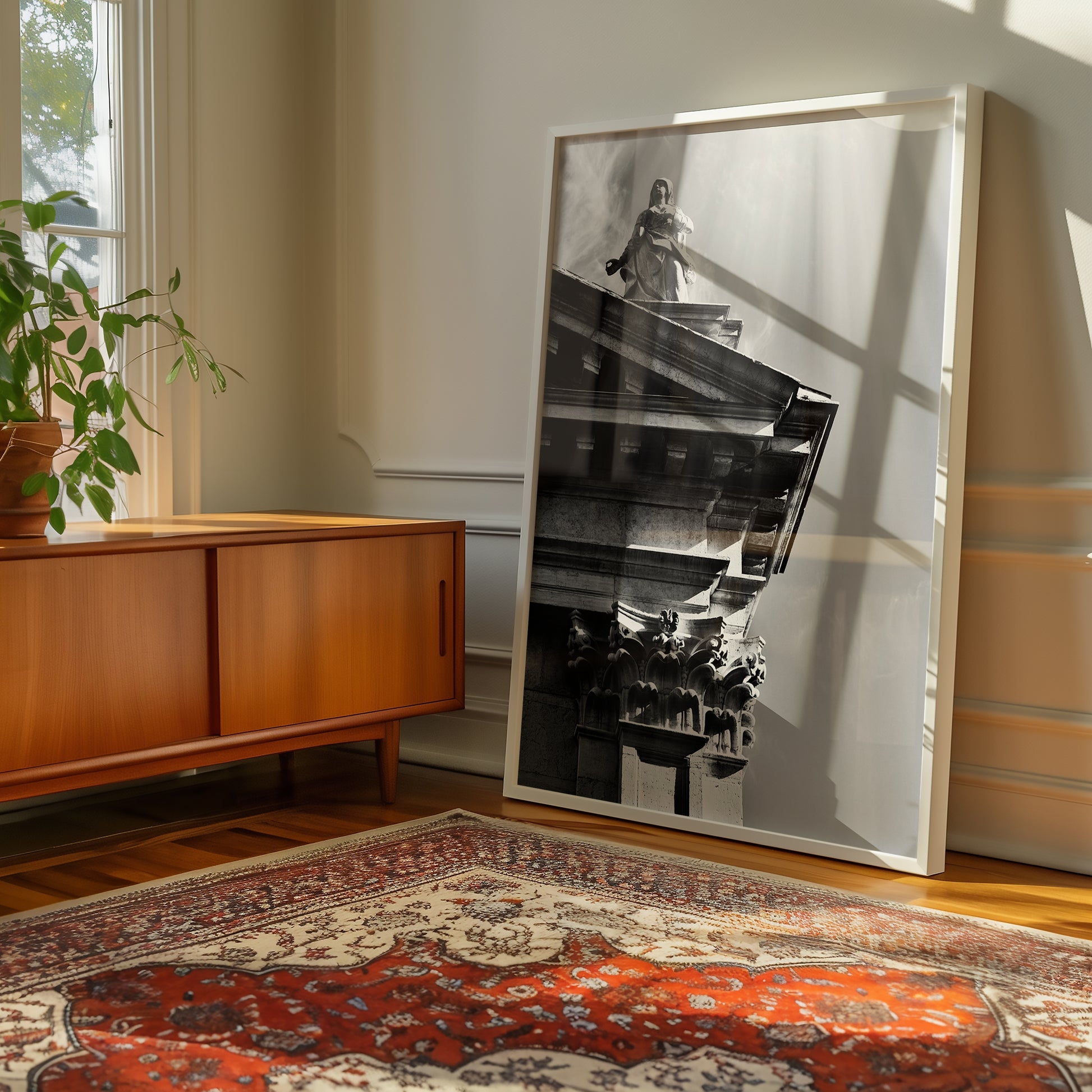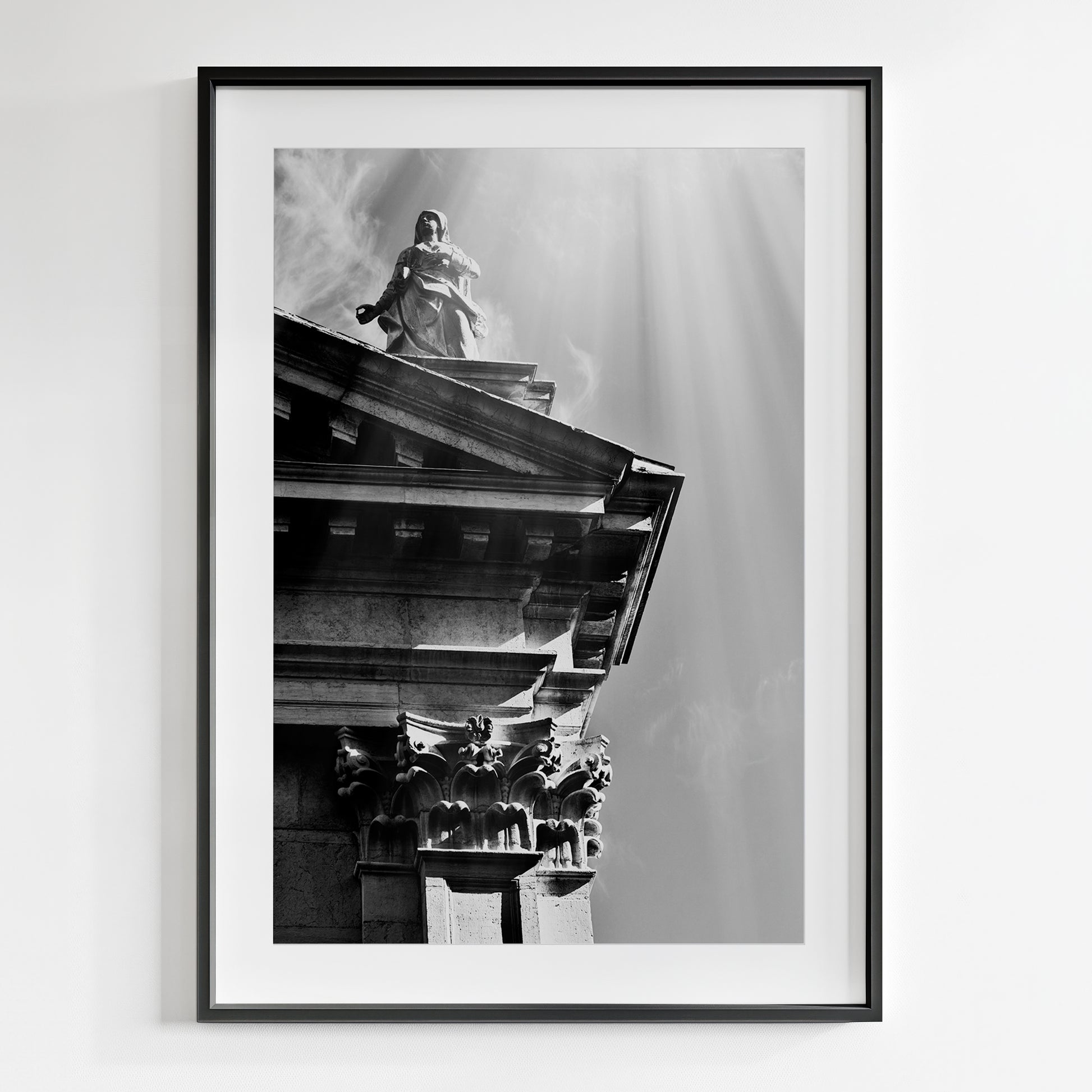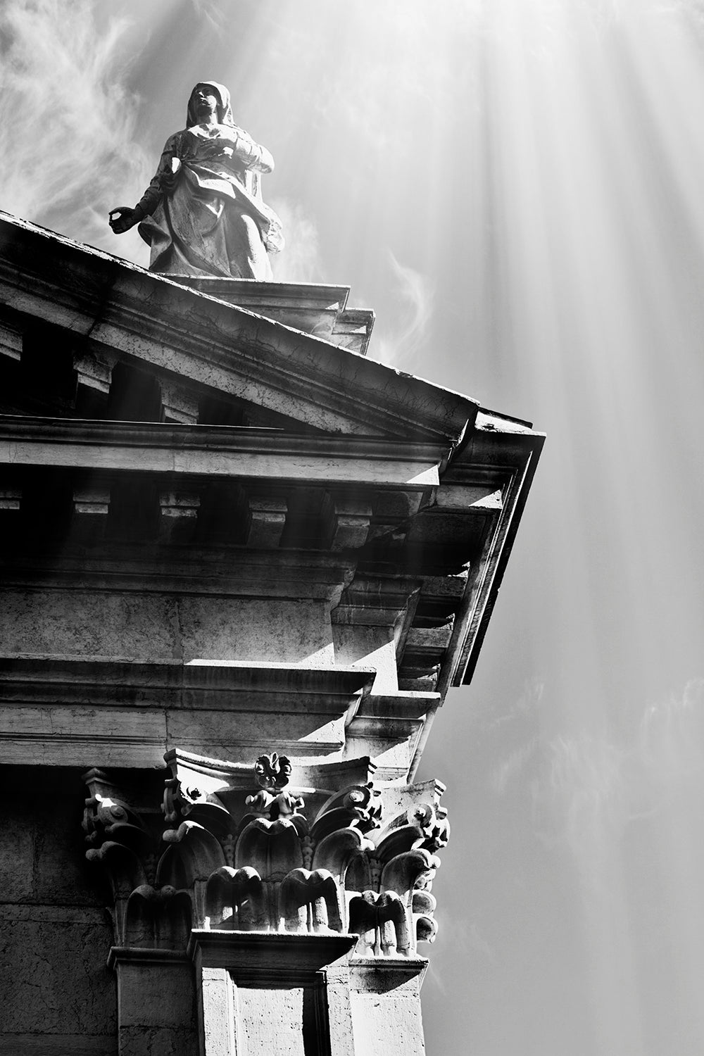 In this collection, Lev strips away color to reveal the pure essence of form, light, and feeling; forcing the viewer into a more intense engagement with the image. By removing the distraction of color, the work compels a focus on the fundamental visual elements: texture, line, and composition. From the sharp, decisive angles of Prow to the quiet, complex contemplation of Middle Age Zen, the works distill subjects down to their core architectural and emotional truths.