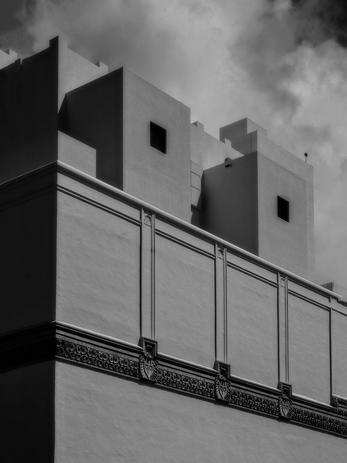 In this collection, Lev strips away color to reveal the pure essence of form, light, and feeling; forcing the viewer into a more intense engagement with the image. By removing the distraction of color, the work compels a focus on the fundamental visual elements: texture, line, and composition. From the sharp, decisive angles of Prow to the quiet, complex contemplation of Middle Age Zen, the works distill subjects down to their core architectural and emotional truths.