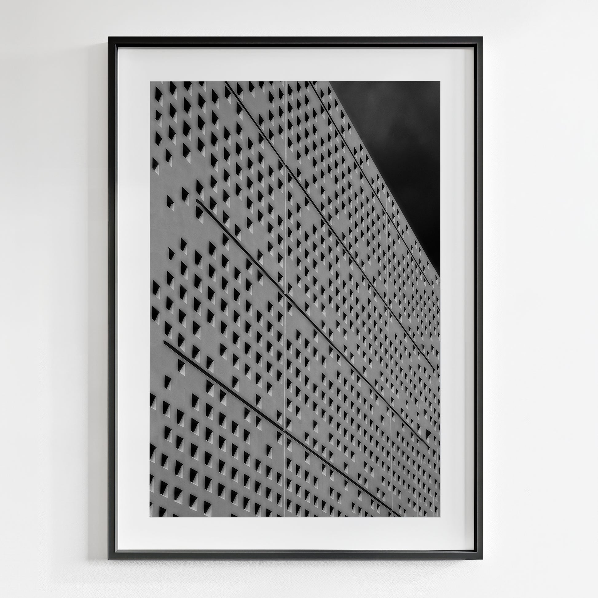 A study in pure geometric rhythm and repetition. The work uses light and the texture of shadow to create intense visual movement and complexity. The bold, repeated pattern seems to vibrate with silent energy, demonstrating how fundamental architectural forms can be stripped of context, yet build into an overwhelming, charged visual field that engages the viewer's eye with its mesmerizing, ordered chaos.